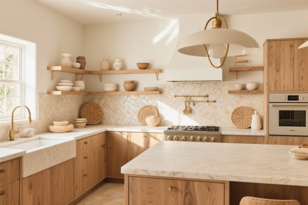 If beige feels flat, it’s not the color—it’s the texture. Mix finishes like fluted wood, zellige tiles, honed stone, and linen shades. Suddenly your kitchen feels boutique, not builder-grade.