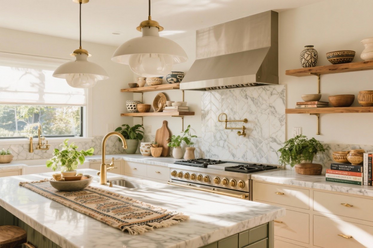 Your **backsplash** is prime real estate for drama. Go beyond basic subway tile with elongated sizes, zellige texture, stacked vertical layouts, or patterned cement tile. A bold stone slab with natural veining? Instant luxury, zero extra styling needed.