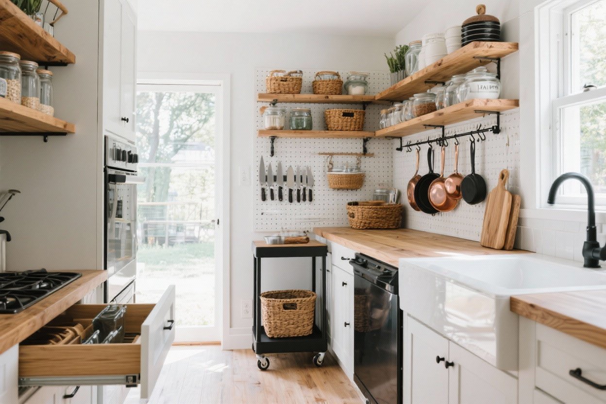 When floor space is tight, your walls become prime real estate. Use them. Think tall cabinets, stacked shelving, and wall-mounted rails—all the things that pull the eye up and make your kitchen feel taller and more organized.