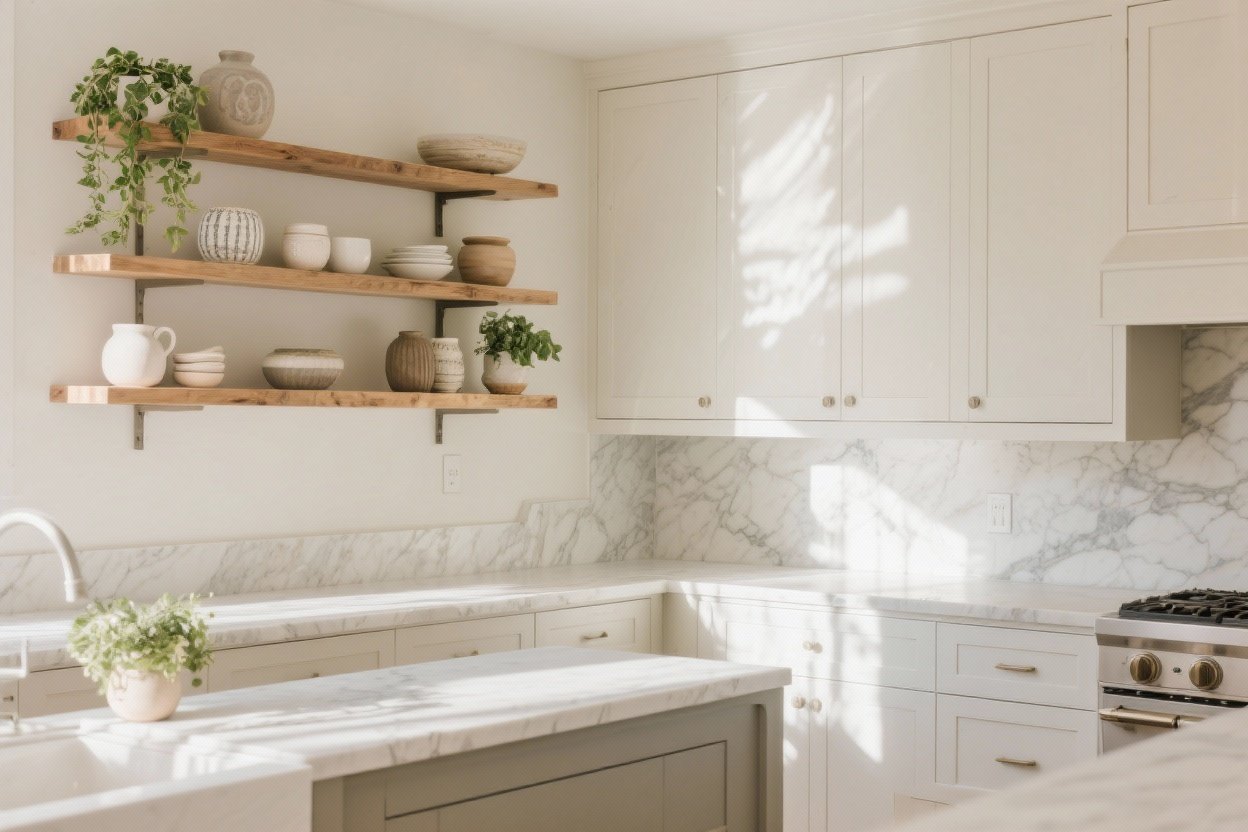 Pro Tip: Finish the back wall behind open shelves in tile or wood to make the area feel designed—not like you forgot cabinet doors.