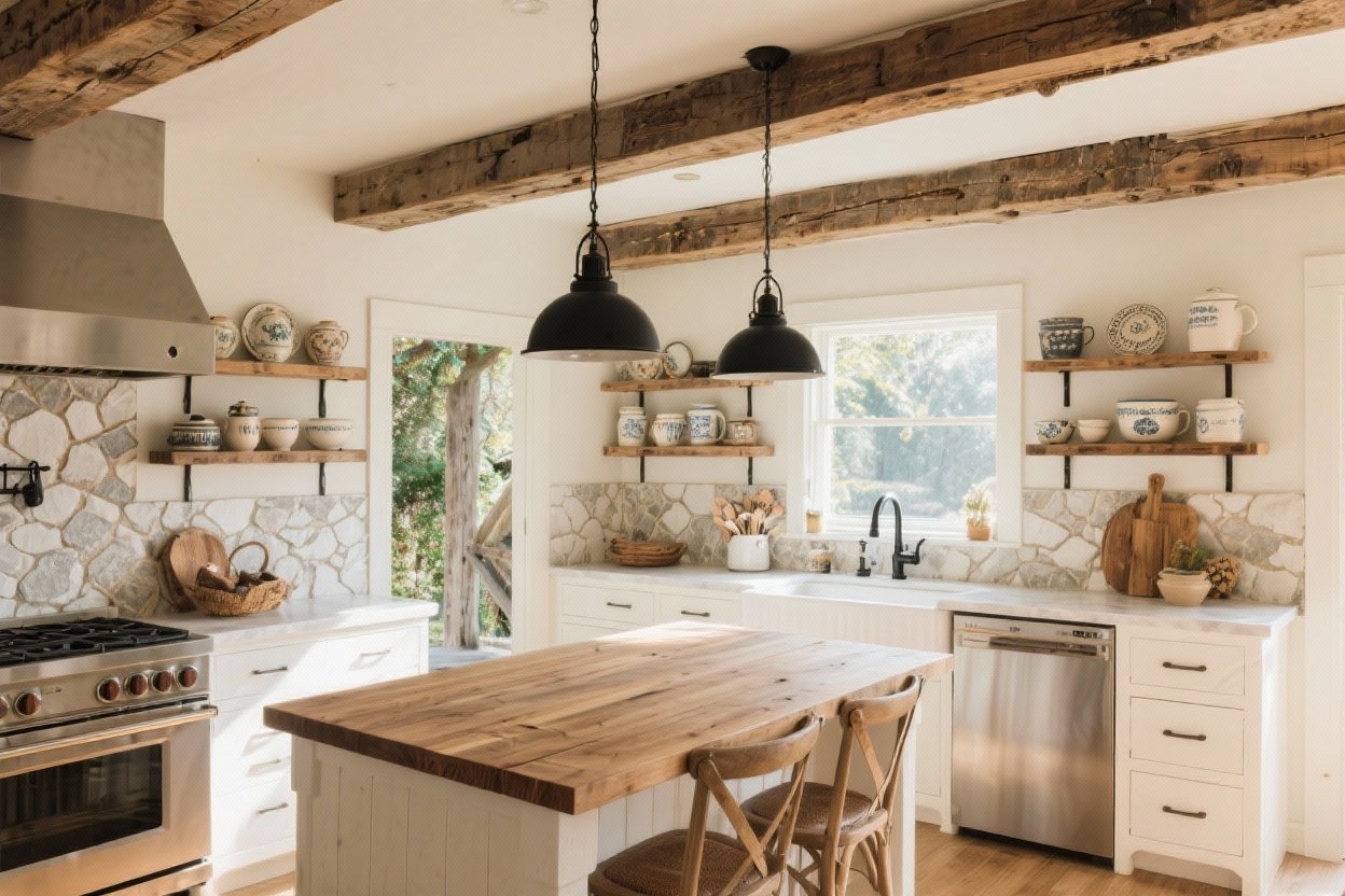 Open shelves are a rustic staple, but only if you curate them. Think thick wood planks with black brackets or floating shelves in a natural finish. Style them with everyday pieces—stoneware bowls, glass jars, copper mugs—so they’re useful and pretty.