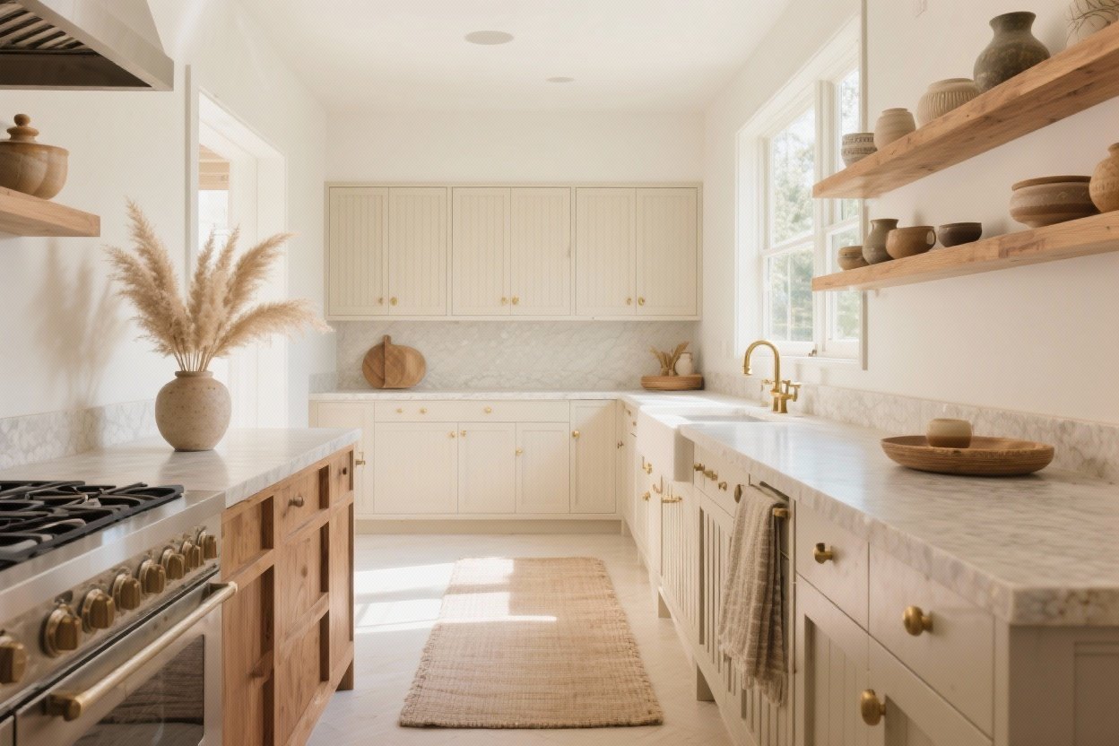 Beige and wood are basically besties. Add warm wood elements—floating shelves, a butcher-block island top, or even wood-trimmed stools—to give your kitchen dimension and that “I live here and it’s cozy” energy.