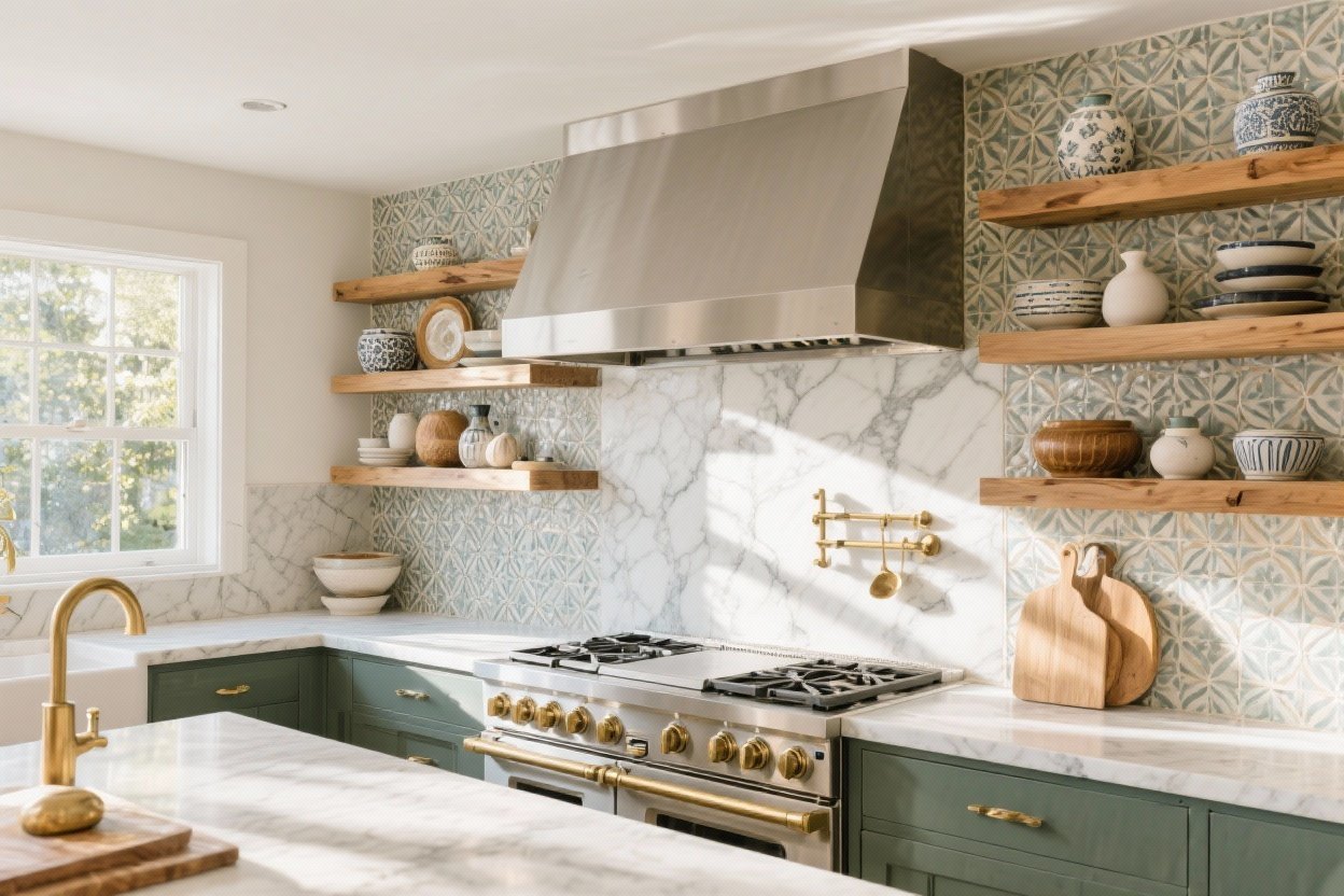 Want warmth and character? Zellige tiles (those glossy, handmade Moroccan tiles) deliver that sunlit, lived-in vibe. Each tile reflects light differently, so your backsplash feels dynamic all day long.