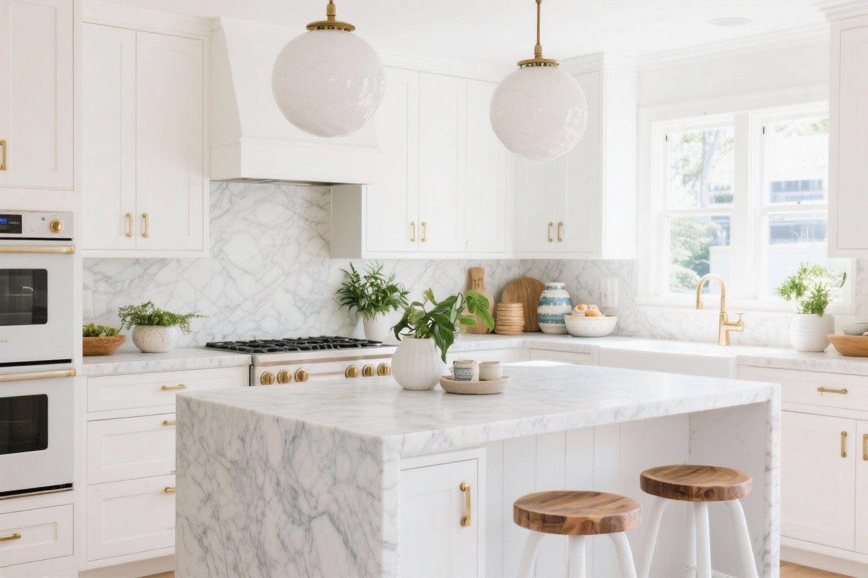 In an all-white kitchen, your countertop and backsplash can be the main character. Designers are loving dramatic veining and full-height stone backsplashes that look like art.