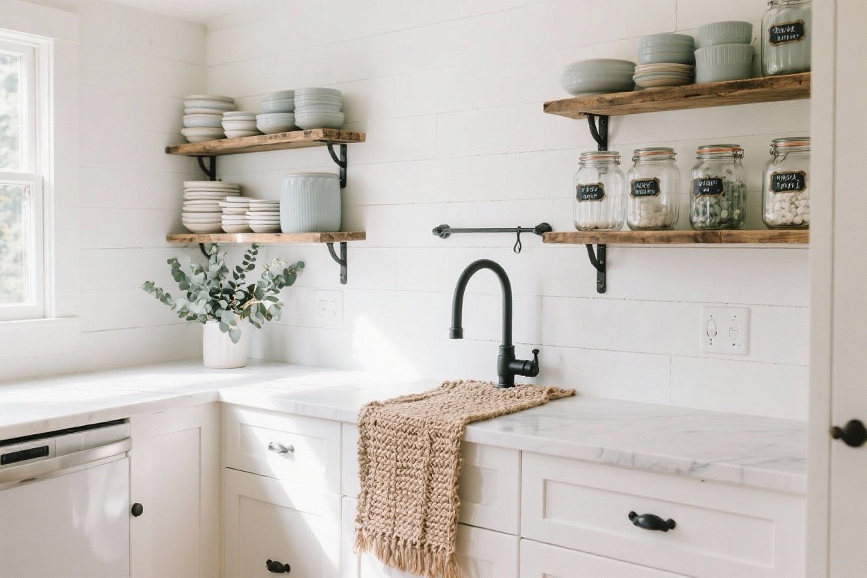 Open shelving is the farmhouse kitchen MVP. It makes small kitchens feel airy and shows off your cutest mugs. Surprise: it’s also crazy affordable.