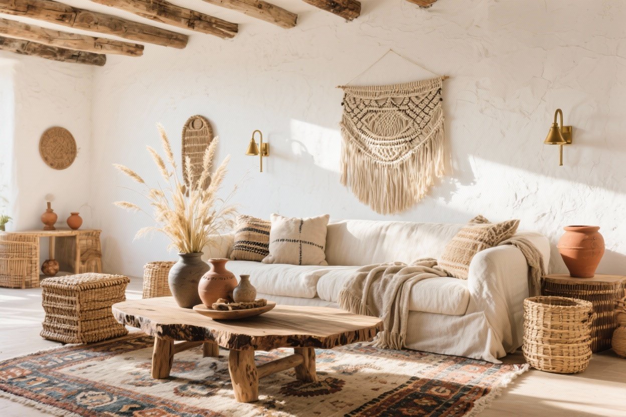 Rustic-boho is all about natural materials—wood, rattan, clay, stone, linen, brass. But here’s the pro move: keep the shapes simple so the materials take the spotlight. Clean lines = collected, not chaotic.